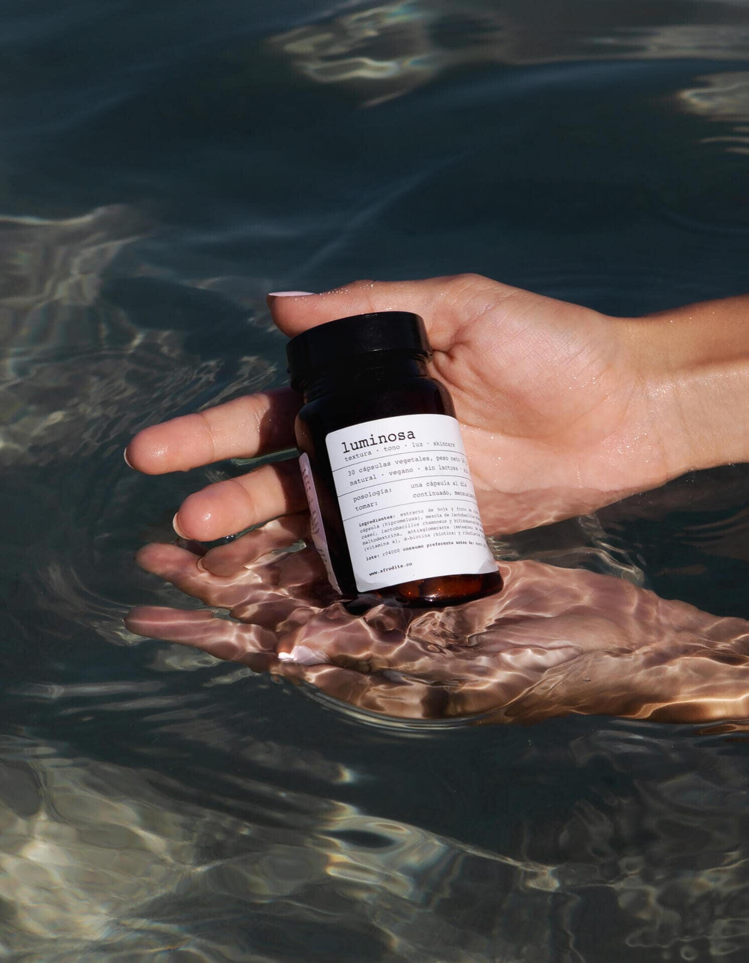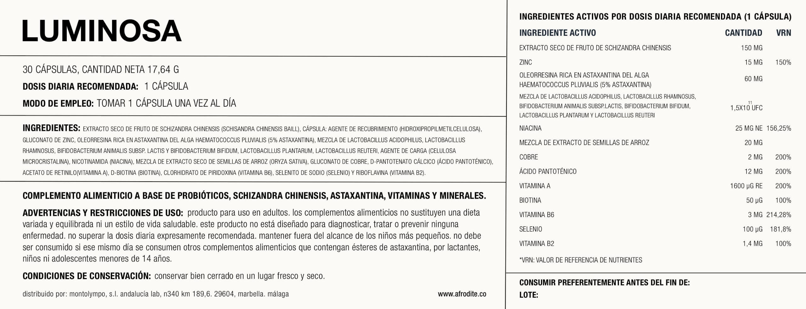 incluye 17 activos naturales, vitaminas y probióticos con equivalencias inspiradas a los beneficios que la piel obtiene del agua de mar. aunque en el caso de luminosa, estos beneficios vendrán desde dentro del cuerpo y con cada regeneración de la piel. es decir, en ciclos de 28 días.los hemos seleccionado y mezclado cuidadosamente en las proporciones adecuadas dentro de cada cápsula para que casi sin darte cuenta, poco a poco, desde el intestino y de forma natural se estimule la regeneración celular y que la piel extraiga el máximo beneficio de cada uno de los ingredientes que hay en el interior de cada cápsula.