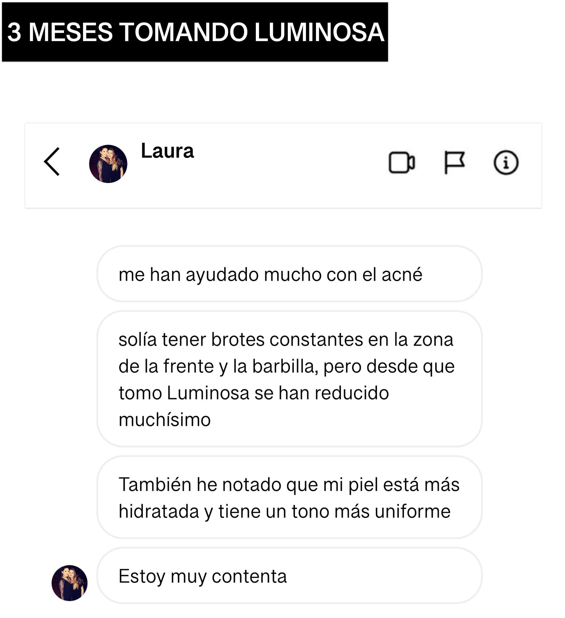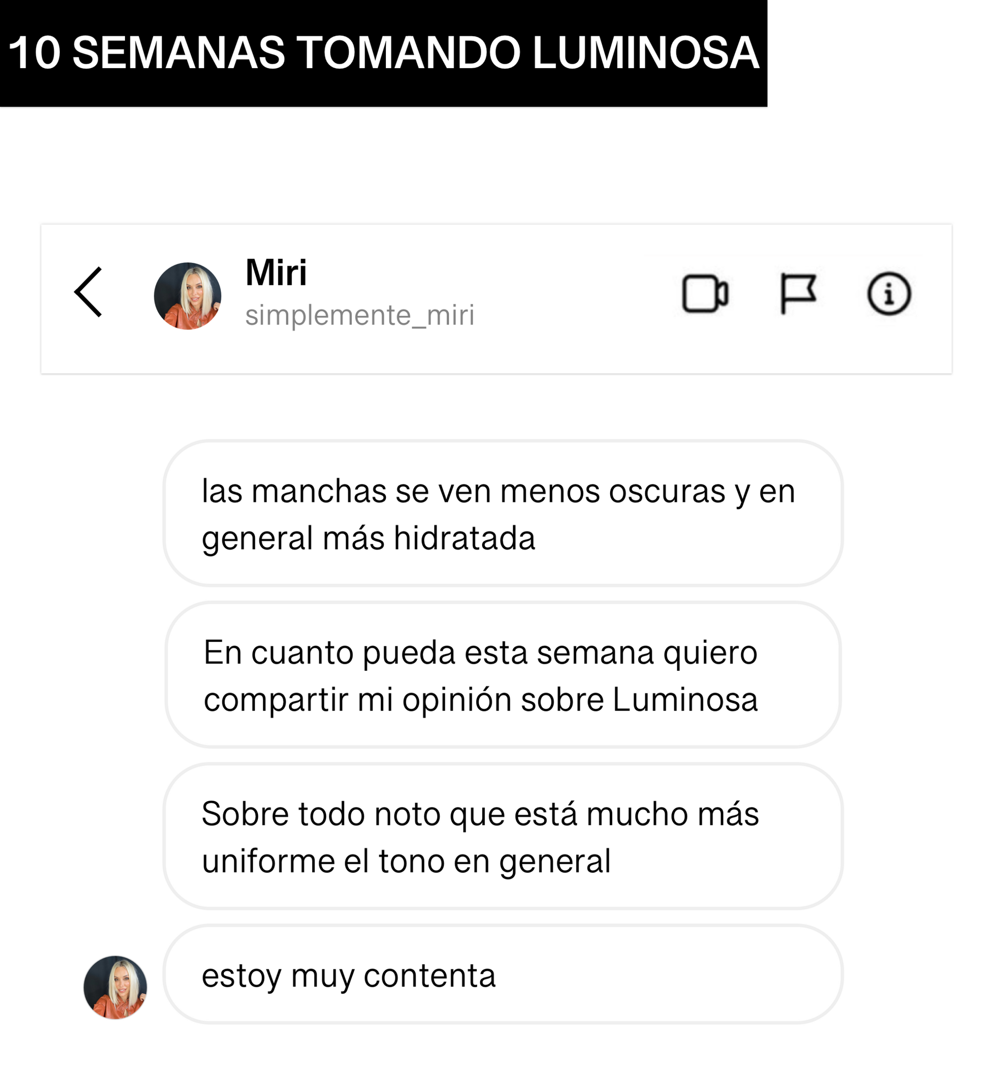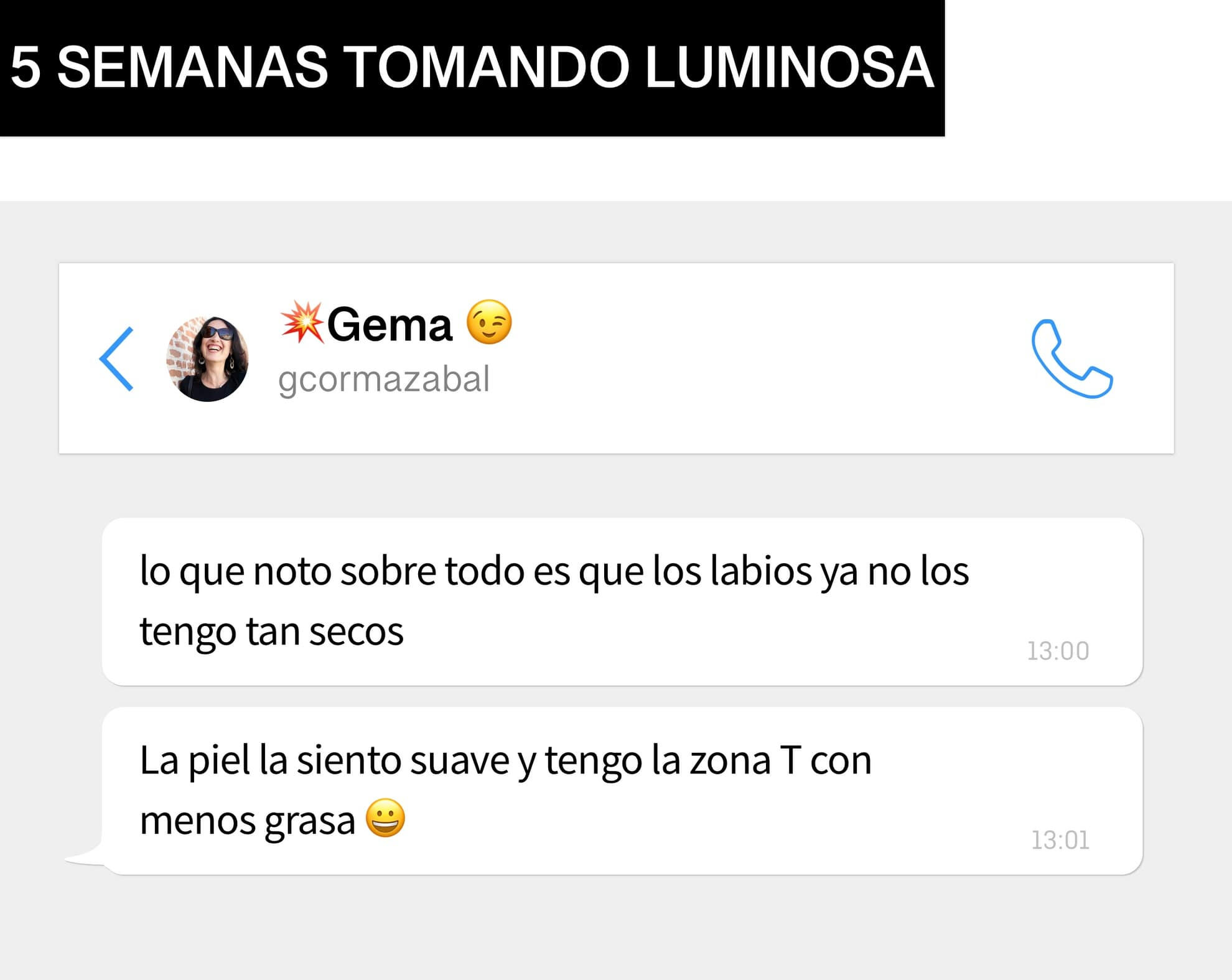 luminosa no tiene contraindicaciones y no existe efecto rebote. es completamente natural, con evidencia científica, vegano, sin gluten ni lactosa.nos importa profundamente la seguridad. todos nuestros ingredientes son reconocidos como seguros por la administración de alimentos y medicamentos (FDA, por sus siglas en inglés) y analizamos con infrarrojos cada activo para verificar la calidad y pureza antes de fabricar cada lote.
